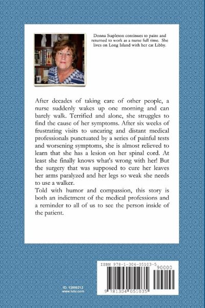 After decades of taking care of other people, a nurse suddenly wakes up one morning and can barely walk. Terrified and alone, she struggles to find the cause of her symptoms. After six weeks of frustrating visits to uncaring and distant medical professionals punctuated by a series of painful tests and worsening symptoms, she is almost relieved to learn that she has a lesion on her spinal cord. At least she finally knows what's wrong with her! But the surgery that was supposed to cure her leaves her arms paralyzed and her legs so weak she needs to use a walker. Told with humor and compassion, this true story is both an indictment of the medical professions and a reminder to all of us to see the person inside of the patient.