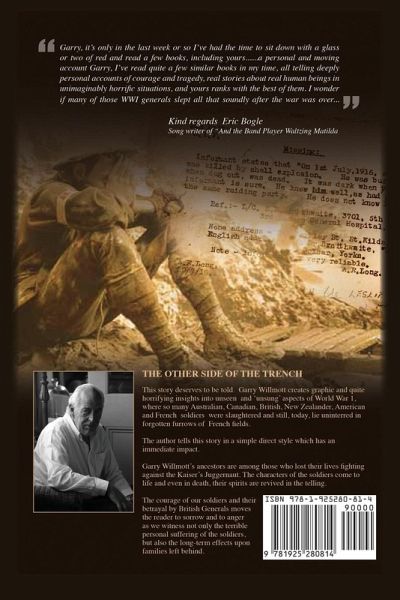 This story deserves to be told. Garry Willmott creates graphic and quite horrifying insights into unseen and 'unsung' aspects of World War 1, where so many Australian, Canadian, British, New Zealander, American and French soldiers were slaughtered and still, today, lie uninterred in forgotten furrows of French fields. The author tells this story in a simple direct style which has an immediate impact. Garry Willmott's ancestors are among those who lost their lives fighting against the Kaiser's Juggernaut. The characters of the soldiers come to life and even in death, their spirits are revived in the telling. The courage of our soldiers and their betrayal by British Generals moves the reader to sorrow and to anger as we witness not only the terrible personal suffering of the soldiers, but also the long-term effects upon families left behind. 'Garry, it's only in the last week or so I've had the time to sit down with a glass or two of red and read a few books, including yours... a personal and moving account Garry, I've read quite a few similar books in my time, all telling deeply personal accounts of courage and tragedy, real stories about real human beings in unimaginably horrific situations, and yours ranks with the best of them. I wonder if many of those WWI generals slept all that soundly after the war was over...' Kind regards, Eric Bogle Songwriter of 'And the Band Played Waltzing Matilda'