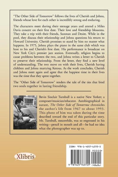 "The Other Side of Tomorrow" follows the lives of Cherish and Johnu, friends whose love for each other is incredibly strong and enduring. The characters meet during their teenage years and attend a Miles Davis concert on their first date. Their love and friendship blossoms. They take a trip with their friends, Sunman and Desire. While in the pool, they discuss their relationship and Johnu questions his return to Howard University. Cherish promises to stand by him no matter what happens. In 1975, Johnu plays the piano in the same club which was host to his and Cherish's first date. His performance is broadcast on New York City's premier jazz station. Eventually, religion begins to cause problems between the two, and Johnu writes a letter to Cherish to preserve their relationship. From the letter, they find a new level of understanding. The two move on with their lives, Cherish having children and Johnu marrying Ketous. As the work concludes, Cherish and Johnu meet again and agree that the happiest time in their lives was the time that they spent together. The "Other Side of Tomorrow" renders the tale of the ties that bind two souls together in lasting friendship.