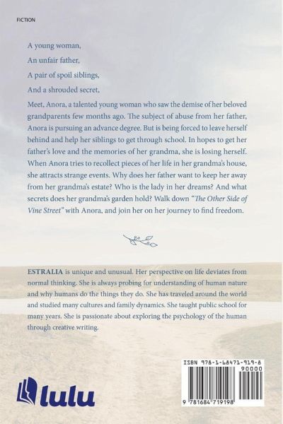 A young woman, An unfair father, A pair of spoil siblings, And a shrouded secret, Meet, Anora, a talented young woman who saw the demise of her beloved grandparents few months ago. The subject of abuse from her father, Anora is pursuing an advance degree. But is being forced to leave herself behind and help her siblings to get through school. In hopes to get her father's love and the memories of her grandma, she is losing herself. When Anora tries to recollect pieces of her life in her grandma's house, she attracts strange events. Why does her father want to keep her away from her grandma's estate? Who is the lady in her dreams? And what secrets does her grandma's garden hold? Walk down "The Other Side of Vine Street" with Anora, and join her on her journey to find freedom.