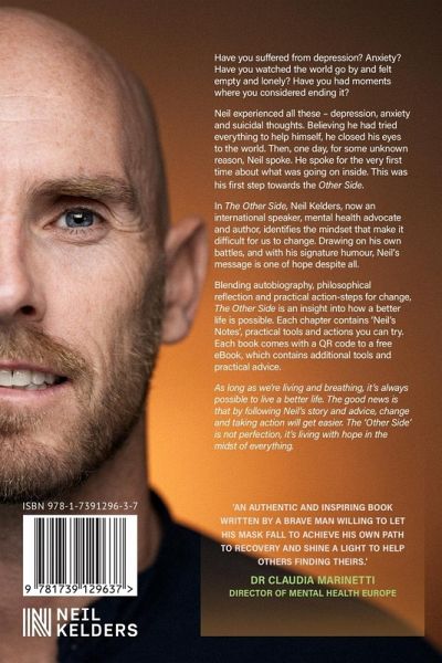 Have you experienced depression? Anxiety? Have you watched as life and people move on around you as you are feeling very lonely and empty inside? Have you had moments where you thought about ending it all? Neil Kelders experienced all these - depression, anxiety & suicidal ideation. Believing he had tried everything to help himself, he closed his eyes to the world. Then one day Neil spoke out. He spoke for the very first time about what was going on inside his head, behind his mask. This was his first step towards the Other Side. In The Other Side, Neil Kelders, international speaker, mental health advocate and author, identifies the mindsets that make it difficult for us to change. Drawing on his own battles, and with his humour, Neil's message is one of hope despite all. Blending autobiography, philosophical insights and practical, action-steps for change, The Other Side is an insight into how a better life is possible. Each chapter contains 'Neil's Notes', practical tools and actions you can try. Each book comes with a QR code to a free eBook, which contains additional tools and practical advice. As long as we're breathing, it is always possible to live a better life. The good news is that by following Neil's story and advice, change and taking action will get easier. The 'Other Side' is not perfection, it's living with hope in the midst of everything.