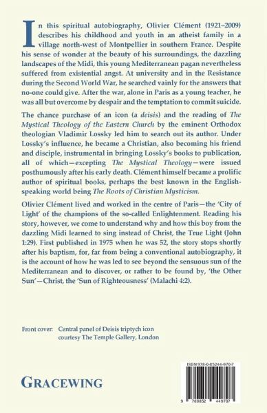 In this spiritual autobiography, Olivier Clément (1921-2009) describes his childhood and youth in an atheist family in a village north-west of Montpellier in southern France. Despite his sense of wonder at the beauty of his surroundings, the dazzling landscapes of the Midi, this young Mediterranean pagan nevertheless suffered from existential angst. At university and in the Resistance during the Second World War, he searched vainly for the answers that no-one could give. After the war, alone in Paris as a young teacher, he was all but overcome by despair and the temptation to commit suicide. The chance purchase of an icon (a deisis) and the reading of The Mystical Theology of the Eastern Church by the eminent Orthodox theologian Vladimir Lossky led him to search out its author. Under Lossky's influence, he became a Christian, also becoming his friend and disciple, instrumental in bringing Lossky's books to publication, all of which-excepting The Mystical Theology-were issued posthumously after his early death. Clément himself became a prolific author of spiritual books, perhaps the best known in the English-speaking world being The Roots of Christian Mysticism. Olivier Clément lived and worked in the centre of Paris-the 'City of Light' of the champions of the so-called Enlightenment. Reading his story, however, we come to understand why and how this boy from the dazzling Midi learned to sing instead of Christ, the True Light (John 1:29). First published in 1975 when he was 52, the story stops shortly after his baptism, for, far from being a conventional autobiography, it is the account of how he was led to see beyond the sensuous sun of the Mediterranean and to discover, or rather to be found by, 'the Other Sun'-Christ, the 'Sun of Righteousness' (Malachi 4:2).