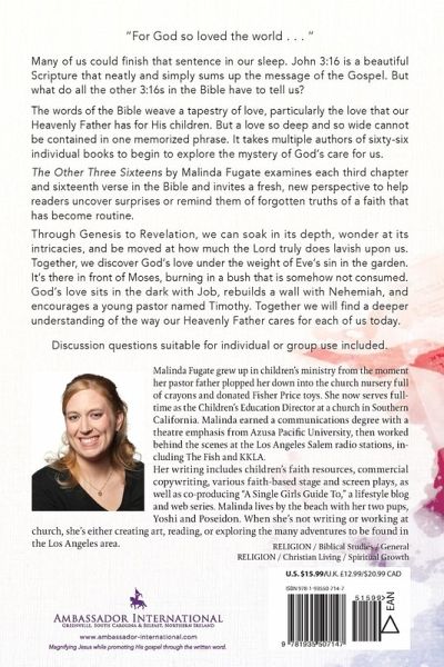 "For God so loved the world . . . " Many of us could finish that sentence in our sleep. John 3:16 is a beautiful Scripture that neatly and simply sums up the message of the Gospel. But what do all the other 3:16s in the Bible have to tell us? The words of the Bible weave a tapestry of love, particularly the love that our Heavenly Father has for His children. But a love so deep and so wide cannot be contained in one memorized phrase. It takes multiple authors of sixty-six individual books to begin to explore the mystery of God's care for us. The Other Three Sixteens by Malinda Fugate examines each third chapter and sixteenth verse in the Bible and invites a fresh, new perspective to help readers uncover surprises or remind them of forgotten truths of a faith that has become routine. Through Genesis to Revelation, we can soak in its depth, wonder at its intricacies, and be moved at how much the Lord truly does lavish upon us. Together, we discover God's love under the weight of Eve's sin in the garden. It's there in front of Moses, burning in a bush that is somehow not consumed. God's love sits in the dark with Job, rebuilds a wall with Nehemiah, and encourages a young pastor named Timothy. Together we will find a deeper understanding of the way our Heavenly Father cares for each of us today. Discussion questions suitable for individual or group use included.