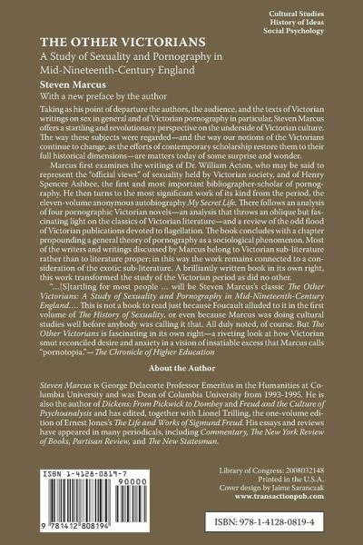 Taking as his point of departure the authors, the audience, and the texts of Victorian writings on sex in general and of Victorian pornography in particular, Steven Marcus offers a startling and revolutionary perspective on the underside of Victorian culture. The subjects dealt with in The Other Victorians are not only those to have been "shocking" in the Victorian period. The way these subjects were regarded--and the way our notions of the Victorians continue to change, as the efforts of contemporary scholarship restore them to their full historical dimensions--are matters today of some surprise and wonder.
