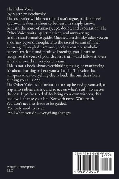 The Other Voice by Matthew Petchinsky There's a voice within you that doesn't argue, panic, or seek approval. It doesn't shout to be heard. It simply knows. Beneath the noise of anxiety, ego, doubt, and expectation, The Other Voice waits-quiet, patient, and unwavering. In this transformative guide, Matthew Petchinsky takes you on a journey beyond thought, into the sacred terrain of inner knowing. Through dreamwork, body sensation, symbolic pattern-tracking, and intuitive listening, you'll learn to recognize the voice of your deepest truth-and follow it, even when the world thinks you're insane. This is not a book about overthinking, fixing, or manifesting. It's about learning to hear yourself again. The voice that whispers when everything else is loud. The one that's been guiding you all along. The Other Voice is an invitation to stop betraying yourself, to step into radical clarity, and to act on what's real-no matter the cost. If you're tired of doubting your own wisdom, this book will change your life. Not with noise. With truth. You don't need to shout to be guided. You only need to listen. And when you do-everything changes.