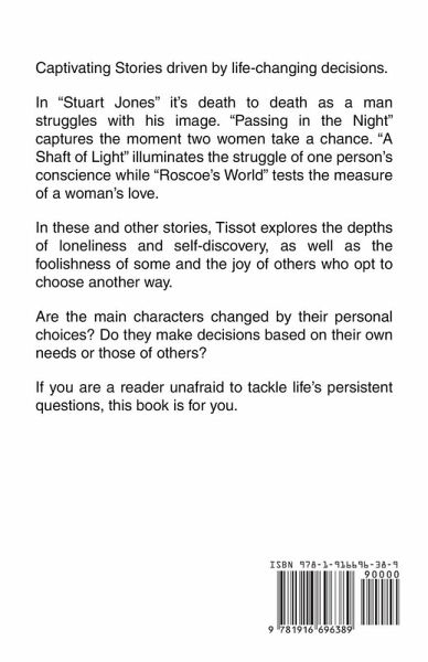Captivating Stories driven by life-changing decisions. In "Stuart Jones" it's death to death as a man struggles with his image. "Passing in the Night" captures the moment two women take a chance. "A Shaft of Light" illuminates the struggle of one person's conscience while "Roscoe's World" tests the measure of a woman's love. In these and other stories, Tissot explores the depths of loneliness and self-discovery, as well as the foolishness of some and the joy of others who opt to choose another way. Are the main characters changed by their personal choices? Do they make decisions based on their own needs or those of others? If you are a reader unafraid to tackle life's persistent questions, this book is for you.
