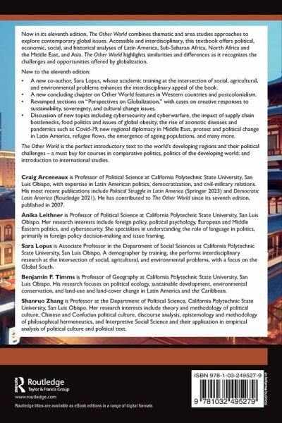 Craig Arceneaux is Professor of Political Science at California Polytechnic State University, San Luis Obispo, with expertise in Latin American politics, democratization, and civil-military relations. His most recent publications include Political Struggle in Latin America (Springer 2023) and Democratic Latin America (Routledge 2021). He has contributed to The Other World since its 7th edition, published in 2007. Anika Leithner is Professor of Political Science at California Polytechnic State University, San Luis Obispo. Her research interests include foreign policy, political psychology, European and Middle Eastern politics, and cybersecurity. She specializes in understanding the role of language in politics, primarily in foreign policy decision-making and issue framing. Sara Lopus is Associate Professor in the Department of Social Sciences at California Polytechnic State University, San Luis Obispo. A demographer by training, she performs interdisciplinary research at the intersection of social, agricultural, and environmental problems, with a focus on the Global South. Benjamin F. Timms is Professor of Geography at California Polytechnic State University, San Luis Obispo. His research focuses on political ecology, sustainable development, environmental conservation, and land-use and land-cover change in Latin America and the Caribbean. Shanruo Zhang is Professor at the Department of Political Science, California Polytechnic State University, San Luis Obispo. Her research interests include theory and methodology of political culture, Chinese and Confucian political culture, discourse analysis, epistemology and methodology of philosophical hermeneutics and Interpretive Social Science and their application in empirical analysis of political culture and political text.