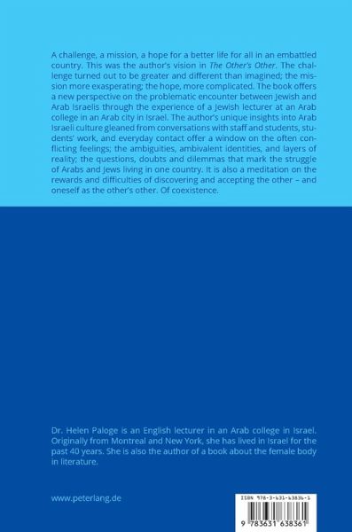 A challenge, a mission, a hope for a better life for all in an embattled country. This was the author's vision in The Other's Other. The challenge turned out to be greater and different than imagined; the mission more exasperating; the hope, more complicated. The book offers a new perspective on the problematic encounter between Jewish and Arab Israelis through the experience of a Jewish lecturer at an Arab college in an Arab city in Israel. The author's unique insights into Arab Israeli culture gleaned from conversations with staff and students, students' work, and everyday contact offer a window on the often conflicting feelings; the ambiguities, ambivalent identities, and layers of reality; the questions, doubts and dilemmas that mark the struggle of Arabs and Jews living in one country. It is also a meditation on the rewards and difficulties of discovering and accepting the other - and oneself as the other's other. Of coexistence.