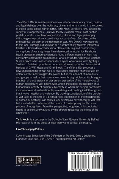 The Other's War is an intervention into a set of contemporary moral, political and legal debates over the legitimacy of war and terrorism within the context of the so-called global War on Terror. Tarik Kochi considers how, despite the variety of its approaches - just war theory, classical realist, post-Kantian, poststructuralist - contemporary ethical, political and legal philosophy still struggles to produce a convincing account of war. Focusing on the philosophical problem of the rightness of war, The Other's War responds to this lack. Through a discussion of a number of key Western intellectual traditions, Kochi demonstrates how often conflicting and contradictory conceptions of war's rightness have developed in modernity. He shows how a process of ordering violence around different notions of right has constantly redrawn the boundaries of what constitutes 'legitimate' violence. Such a process has consequences for anyone who claims to be fighting a 'just war'. Building upon this account and drawing upon the philosophical heritage of G.W.F. Hegel and Ernst Bloch, The Other's War proposes a new understanding of war, not just as a social condition characterised by violent conflict and struggles for power, but as the attempt of individuals and groups to realise their normative claims through violence. Kochi argues that both of these aspects of war are an expression of the metaphysics of human subjectivity. War begins with, and is the radical exaggeration of, a fundamental activity of human subjectivity, in which the subject constitutes its normative and material identity; realising and positing itself through acts that involve negation and violence. By drawing consideration of the problem of war back to the level of a philosophical examination of the metaphysics of human subjectivity, The Other's War develops a novel theory of war that helps us to better understand the nature of contemporary conflict as a process of recognition. From this perspective, judgment, it is concluded, needs to be constantly guided by the effort to recognise the ethics of the other's war.