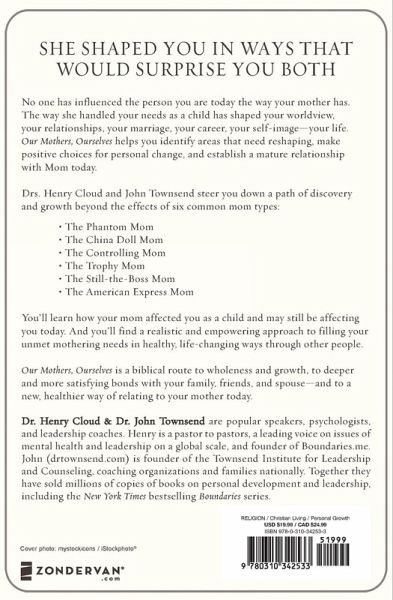 In Our Mothers, Ourselves, Henry Cloud and John Townsend show how understanding how our mothers have profoundly influenced our lives can set us on a path toward wholeness and growth. No one has influenced the person you are today like your mother. The way she handled your needs as a child has shaped your worldview, your relationships, your marriage, your career, your self-image - your life. Our Mothers, Ourselves can help you identify areas that need reshaping, to make positive choices for personal change, and to establish a mature relationship with Mom today.The Phantom Mom The China Doll Mom The Controlling Mom The Trophy Mom The Still-the-Boss Mom The American Express Mom You'll learn how your mom affected you as a child and may still be affecting you today. Our Mothers, Ourselves is a biblical, realistic, and empowering route to wholeness and growth, to deeper and more satisfying bonds with your family, friends, and spouse - and to a new, healthier way of relating to your mother. This book was previously titled The Mom Factor.