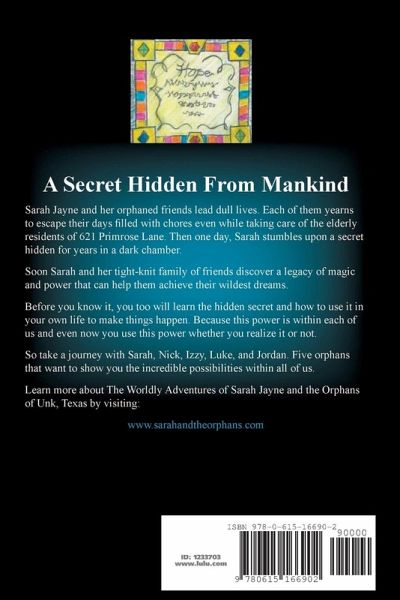 Sarah Jayne and her orphaned friends lead dull lives. Each of them wanting to escape their days filled with chores and taking care of the elderly residents of 621 Primrose Lane. Then one day, Sarah stumbles upon a secret hidden for years in a dark chamber. Soon Sarah and her friends discover a legacy of power, power that each of us has within ourselves. And as they learn about the immutable laws of the Universe, they also learn valuable life skills about dreaming, planning and acting on their deepest desires. This book series is the only one of its kind meant specifically for children and young adults that teaches them the lessons of so many of the self-improvement Masters out there like Earl Nightingale, Bob Proctor, Bob Doyle, and so many others.
