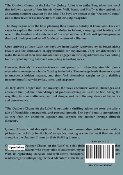 "The Outdoor Chums on the Lake" by Quincy Allen is an enthralling adventure novel that follows a group of four friends¿Jerry, Will, Frank, and Bluff¿as they embark on an exciting summer vacation by the lake. The boys are known as the "Outdoor Chums" due to their love for outdoor activities and thrilling escapades. The story begins with the boys planning their summer holiday at Loon Lake. They are eager to explore the vast wilderness, indulge in fishing, camping, and boating, and revel in the freedom and excitement of the great outdoors. Their anticipation grows as they pack their gear and set off for the adventure of a lifetime. Upon arriving at Loon Lake, the boys are immediately captivated by its breathtaking beauty and the abundance of opportunities for exploration. They are determined to make the most of their time and are soon engaged in thrilling activities such as fishing for the legendary "big bass" and competing in boating races. However, their idyllic vacation takes an unexpected turn when they stumble upon a mysterious message in a bottle floating in the lake. The message leads them on a quest to uncover a hidden treasure, and they find themselves caught up in a thrilling treasure hunt filled with twists, turns, and suspense. As they delve deeper into the mystery, the boys encounter various challenges and obstacles that put their friendship and problem-solving skills to the test. Along the way, they form new alliances, confront danger, and learn the importance of teamwork and perseverance. "The Outdoor Chums on the Lake" is not only a thrilling adventure story but also a tale of friendship, camaraderie, and personal growth. The boys' bond is strengthened as they face the unknown together and support one another through difficult moments. Quincy Allen's vivid descriptions of the lake and surrounding wilderness create a picturesque backdrop for the boys' escapades, making readers feel as if they are right alongside the Outdoor Chums on their thrilling journey. Overall, "The Outdoor Chums on the Lake" is a delightful and engaging novel that will appeal to readers who enjoy tales of adventure, mystery, and the great outdoors. With its captivating storyline and well-drawn characters, the book is sure to leave readers eagerly anticipating the next adventure of the beloved Outdoor Chums."