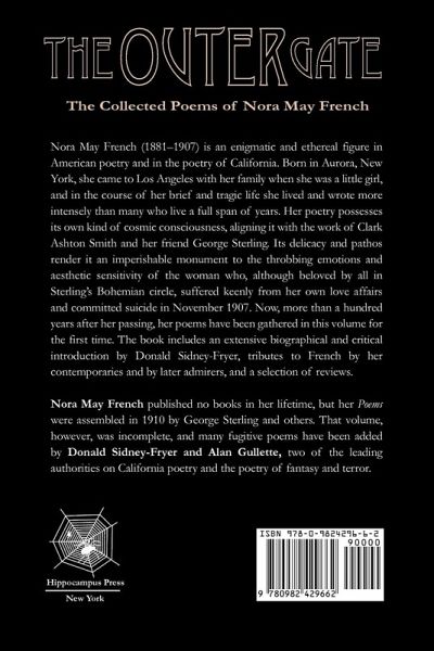 Nora May French (1881-1907) is an enigmatic and ethereal figure in American poetry and in the poetry of California. Born in Aurora, New York, she came to Los Angeles with her family when she was a little girl, and in the course of her brief and tragic life she lived and wrote more intensely than many who live a full span of years. Her poetry possesses its own kind of cosmic consciousness, aligning it with the work of Clark Ashton Smith and her friend George Sterling. Its delicacy and pathos render it an imperishable monument to the throbbing emotions and aesthetic sensitivity of the woman who, although beloved by all in Sterling's Bohemian circle, suffered keenly from her own love affairs and committed suicide in November 1907. Now, more than a hundred years after her passing, her poems have been gathered in this volume for the first time. The book includes an extensive biographical and critical introduction by Donald Sidney-Fryer, tributes to French by her contemporaries and by later admirers, and a selection of reviews. Nora May French published no books in her lifetime, but her poems were assembled in 1910 by George Sterling and others. That volume, however, was incomplete, and many fugitive poems have been added by Donald Sidney-Fryer and Alan Gullette, two of the leading authorities on California poetry and the poetry of fantasy and terror. The new edition of Nora May French is a major addition to the study of California literature. I have always believed that it is of paramount importance for a newly rediscovered poet to be introduced by good biographical and critical prose. Your edition is exemplary in this regard which is so often a failing in such projects. You have made her now permanently available to readers.¿ ¿Dana Gioia, poet, author and former chairman of the National Endowment for the Arts