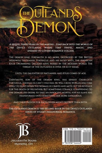 A sequel three years in the making... Jump back into the world of the Devil's Outlands, where time travel, magic, and enemies-to-lovers romance collide. The demon king Zor'imuth is no more, destroyed by the British werewolf Nathaniel Fortescue and his fated mate, the American Kylie Drummond. Decades have passed in the modern world. The threat of the Outlands is over, or so it seems. Until the daughter of Nathaniel and Kylie comes of age. Zaen'imuth, son of the demon king, has sensed Charlotte Fortescue, though he can't find her. He will cross worlds and time itself to hunt down the woman he craves and mete out his revenge for the death of his father. But something strange is happening to the demon. His desire to take an innocent mortal for his slave has transformed into something far more dangerous. And their passion for each other might destroy them both. The Outlands Demon is the second book in the Devil's Outlands series of steamy paranormal romance.