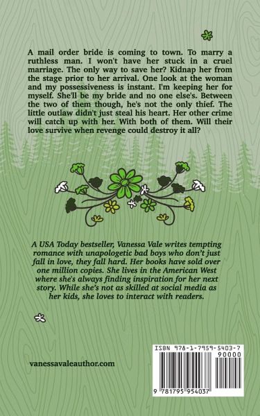 A mail order bride is coming to town. To marry a ruthless man. I won't have her stuck in a cruel marriage. The only way to save her? Kidnap her from the stage prior to her arrival. One look at the woman and my possessiveness is instant. I'm keeping her for myself. She'll be my bride and no one else's. Between the two of them though, he's not the only thief. The little outlaw didn't just steal his heart. Her other crime will catch up with her. With both of them. Will their love survive when revenge could destroy it all?