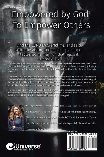 Through poetry and essays, the contributing writers of The Outpouring pour out their souls. They pour out their disappointment, hurt, and grief as well as their success, happiness, and joy through the written word. The selections point to the underlying faith and hope they have in their walk with God. Compiled and edited by LaTonja Brown, the anthology contains works by members of Pentecostal Covenant Church in Seattle, Washington. The tone, mood, and sentiment express a wide range of human emotions. The writings address a range of topics including what writing means to the writers, seeking God, becoming free, empowerment, hope, purpose, aging, and social issues. The selections often discuss serious and heartfelt topics, as the writers pour out the emotions and feelings that are inside of them. Even during their struggles, the writers focus on their underlying belief in God. Their belief that all things will work out for their good.