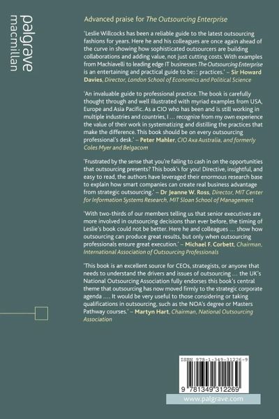 'Leslie Willcocks has been a reliable guide to the latest outsourcing fashions for years. Here he and his colleagues are once again ahead of the curve in showing how sophisticated outsourcers are building collaborations and adding value, not just cutting costs. With examples from Machiavelli to leading edge IT businesses the Outsourcing Enterprise is an entertaining and practical guide to best practices.' - Sir Howard Davies, Director, London School of Economics and Political Science