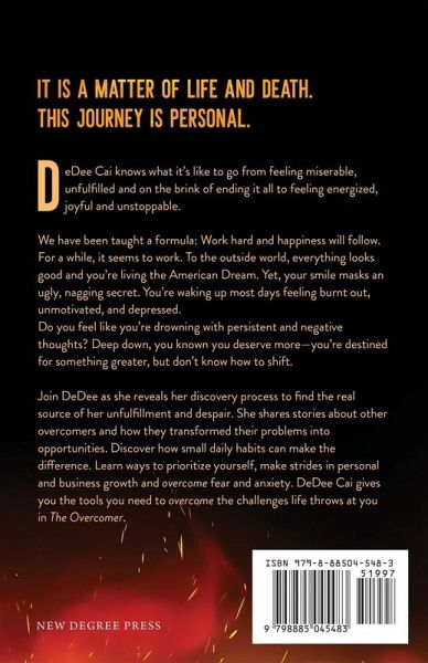 It was a matter of life and death. This journey is personal. DeDee Cai knows what it's like to go from feeling miserable, unfulfilled and on the brink of ending it all to feeling energized, joyful and unstoppable. We have been taught a formula: Work hard; wealth and happiness will follow. For a while, it seems to work. To the outside world, everything looks good and you're living the American Dream. Yet, your smile masks an ugly, nagging secret. Are you waking up most days feeling burnt out, unmotivated, and depressed? Do you feel like you're drowning with persistent negative thoughts? Deep down, you know you deserve more-you're destined for something greater, but don't know how to shift. Join DeDee as she reveals her discovery process to find the real source of her unfulfillment and despair. She shares stories about other overcomers and how they transformed their problems into opportunities. Discover how small daily habits can make the difference. Learn ways to prioritize yourself, make strides in personal and business growth as you overcome fear and anxiety. DeDee Cai gives you the tools you need to overcome the challenges life throws at you in The Overcomer.