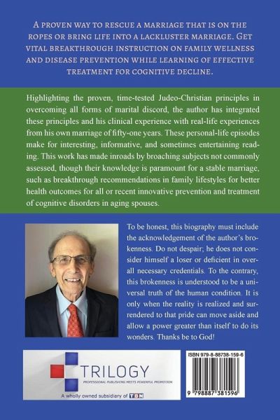 A PROVEN WAY TO RESCUE A MARRIAGE THAT IS ON THE ROPES OR BRING LIFE INTO A LACKLUSTER MARRIAGE. GET VITAL BREAKTHROUGH INSTRUCTION ON FAMILY WELLNESS AND DISEASE PREVENTION WHILE LEARNING EFFECTIVE TREATMENT FOR COGNITIVE DECLINE. ¿¿Highlighting the proven, time-tested Judeo-Christian principles in overcoming all forms of marital discord, the author has integrated these principles and his clinical experience with real-life experiences from his own marriage of fifty-one years. These personal-life episodes make for interesting, informative, and sometimes entertaining reading. This work has made inroads by broaching subjects not commonly assessed, though their knowledge is paramount for a stable marriage, such as breakthrough recommendations in family lifestyles for better health outcomes for all or recent innovative prevention and treatment of cognitive disorders in aging spouses.