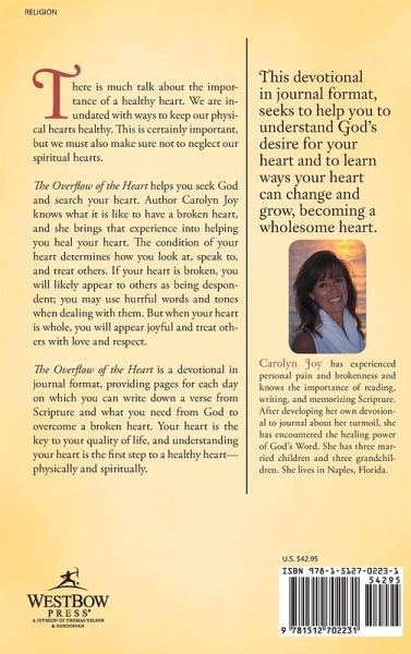 There is much talk about the importance of a healthy heart. We are inundated with ways to keep our physical hearts healthy. This is certainly important, but we must also make sure not to neglect our spiritual hearts. The Overflow of the Heart helps you seek God and search your heart. Author Carolyn Joy knows what it is like to have a broken heart, and she brings that experience into helping you heal your heart. The condition of your heart determines how you look at, speak to, and treat others. If your heart is broken, you will likely appear to others as being despondent; you may use hurtful words and tones when dealing with them. But when your heart is whole, you will appear joyful and treat others with love and respect. The Overflow of the Heart is a devotional in journal format, providing pages for each day on which you can write down a verse from Scripture and what you need from God to overcome a broken heart. Your heart is the key to your quality of life, and understanding your heart is the first step to a healthy heart—physically and spiritually.