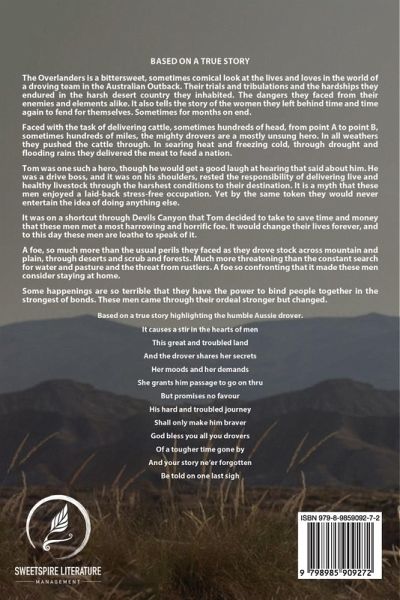 Based on a true story The Overlanders is a bittersweet, sometimes comical look at the lives and loves in the world of a droving team in the Australian Outback. Their trials and tribulations and the hardships they endured in the harsh desert country they inhabited. The dangers they faced from their enemies and elements alike. It also tells the story of the women they left behind time and time again to fend for themselves. Sometimes for months on end. Faced with the task of delivering cattle, sometimes hundreds of head, from point A to point B, sometimes hundreds of miles, the mighty drovers are a mostly unsung hero. In all weathers they pushed the cattle through. In searing heat and freezing cold, through drought and flooding rains they delivered the meat to feed a nation. Tom was one such a hero, though he would get a good laugh at hearing that said about him. He was a drive boss, and it was on his shoulders, rested the responsibility of delivering live and healthy livestock through the harshest conditions to their destination. It is a myth that these men enjoyed a laid-back stress-free occupation. Yet by the same token they would never entertain the idea of doing anything else. It was on a shortcut through Devils Canyon that Tom decided to take to save time and money that these men met a most harrowing and horrific foe. It would change their lives forever, and to this day these men are loathe to speak of it. A foe, so much more than the usual perils they faced as they drove stock across mountain and plain, through deserts and scrub and forests. Much more threatening than the constant search for water and pasture and the threat from rustlers. A foe so confronting that it made these men consider staying at home. Some happenings are so terrible that they have the power to bind people together in the strongest of bonds. These men came through their ordeal stronger but changed.