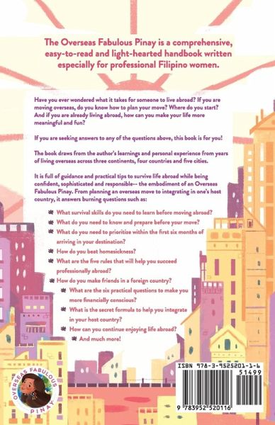 The Overseas Fabulous Pinay is a comprehensive, easy-to-read and light-hearted handbook written especially for people living abroad or planning a move overseas. Have you ever wondered what it takes for someone to live abroad? If you are moving overseas, do you know how to plan your move? Where do you start? And if you are already living abroad, how can you make your life more meaningful and fun? If you are seeking answers to any of the questions above, this book is for you! The book draws from the author's learnings and personal experience from years of living overseas across three continents, four countries and five cities. It is full of guidance and practical tips to survive life abroad while being confident, sophisticated and responsible--the embodiment of an Overseas Fabulous Pinay. From planning an overseas move to integrating in one's host country, it answers burning questions such as: ¿ What survival skills do you need to learn before moving abroad? ¿ What do you need to know and prepare before your move? ¿ What do you need to prioritize within the first six months of arriving in your destination? ¿ How do you beat homesickness? ¿ What are the five rules that will help you succeed professionally abroad? ¿ How do you make friends in a foreign country? ¿ What are the six practical questions to make you more financially conscious? ¿ What is the secret formula to help you integrate in your host country? ¿ How can you continue enjoying life abroad? And much more! The Overseas Fabulous Pinay: A modern Filipina's handbook on how to thrive abroad won the Best Independent Book Award 2021 for Nonfiction - Living Abroad, Gold Award in Literary Titan Book Awards 2021,Gold award in the 2020 Nonfiction Book Awards by the Nonfiction Authors Association and was honored as a finalist in the Best Interior Design Category in the 2020 International Book Awards.