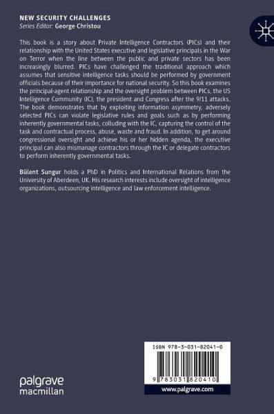 This book is a story about Private Intelligence Contractors (PICs) and their relationship with the United States executive and legislative principals in the War on Terror when the line between the public and private sectors has been increasingly blurred. PICs have challenged the traditional approach which assumes that sensitive intelligence tasks should be performed by government officials because of their importance for national security. So this book examines the principal-agent relationship and the oversight problem between PICs, the US Intelligence Community (IC), the president and Congress after the 9/11 attacks. The book demonstrates that by exploiting information asymmetry, adversely selected PICs can violate legislative rules and goals such as by performing inherently governmental tasks, colluding with the IC, capturing the control of the task and contractual process, abuse, waste and fraud. In addition, to get around congressional oversight and achieve his or her hidden agenda, the executive principal can also mismanage contractors through the IC or delegate contractors to perform inherently governmental tasks.
