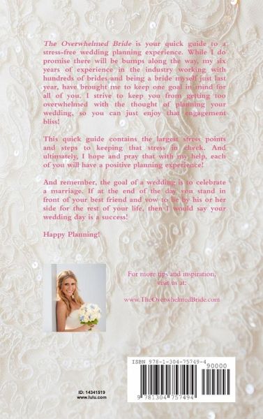 The Overwhelmed Bride is your quick guide to a stress-free wedding planning experience. While I do promise that there will be bumps along the way, my six years of experience helping hundreds of brides with their planning and being a bride myself just last year, has brought me to keep one goal in mind for all of you. I strive to keep you from getting too overwhelmed with the thought of planning your own wedding, so you can just enjoy that engagement bliss! This quick guide contains the largest stress points and steps to keeping that stress in check. And ultimately, I hope and pray that with my help, each of you will have a positive planning experience. And remember, the goal of a wedding is to celebrate a marriage. If at the end of the day you stand in front of your best friend and vow to be by his or her side for the rest of your life, then I would say your wedding day is a success! Happy Planning!