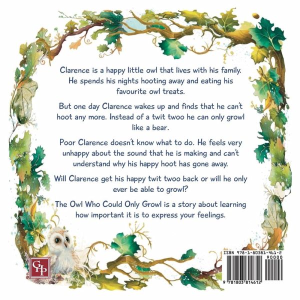 Clarence is a happy little owl that lives with his family. He spends his nights hooting away and eating his favourite owl treats. But one day Clarence wakes up and finds that he can't hoot any more. Instead of a twit twoo he can only growl like a bear. Poor Clarence doesn't know what to do. He feels very unhappy about the sound that he is making and can't understand why his happy hoot has gone away. With the help of his family, Clarence realises that nobody feels happy all of the time and it is actually ok to not feel ok. Will Clarence get his happy twit twoo back or will he only ever be able to growl? The Owl Who Could Only Growl is a story about learning how important it is to express your feelings.
