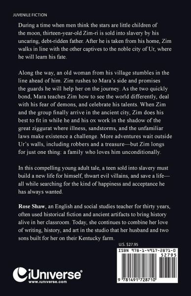During a time when men think the stars are little children of the moon, thirteen-year-old Zim-ri is sold into slavery by his uncaring, debt-ridden father. After he is taken from his home, Zim walks in line with the other captives to the noble city of Ur, where he will learn his fate. Along the way, an old woman from his village stumbles in the line ahead of him. Zim rushes to Mara's side and promises the guards he will help her on the journey. As the two quickly bond, Mara teaches Zim how to see the world differently, deal with his fear of demons, and celebrate his talents. When Zim and the group finally arrive in the ancient city, Zim does his best to fit in while he and his ox work in the shadow of the great ziggurat where illness, sandstorms, and the unfamiliar laws make existence a challenge. More adventures wait outside Ur's walls, including robbers and a treasure-but Zim longs for just one thing: a family who loves him unconditionally. In this compelling young adult tale, a teen sold into slavery must build a new life for himself, thwart evil villains, and save a life-all while searching for the kind of happiness and acceptance he has always wanted.