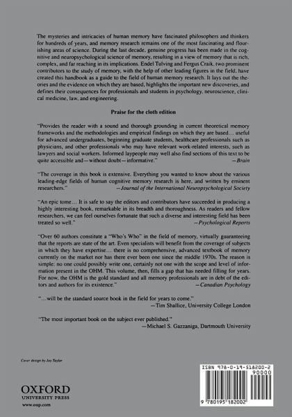 "Tulving and Craik's splendid handbook will be the standard source book in the field for years to come. This is for three reasons. The first is the thoroughness of the coverage of memory-experimental, theoretical, developmental, clinical, and brain-based approaches are all well covered. The second is that virtually all the eminent researchers in the field have been persuaded to contribute. The third consists in the thoroughness and depth of their contributions and of the way that they have been edited."-Tim Shallice, University College London
