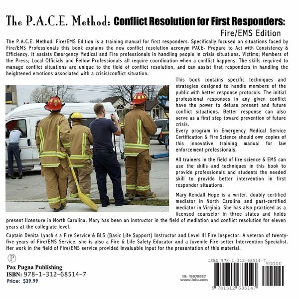 The P.A.C.E. Method: Conflict Resolution for First Responders: Fire/EMS Edition contains specific techniques and strategies designed to handle members of the public with better response protocols. The initial professional responses in any given conflict have the power to defuse present and future conflict situations. Better response can also serve as a step toward prevention of future crisis. Every program in Emergency Medical Service Certification & Fire Science should own copies of this innovative training manual for law enforcement professionals.
