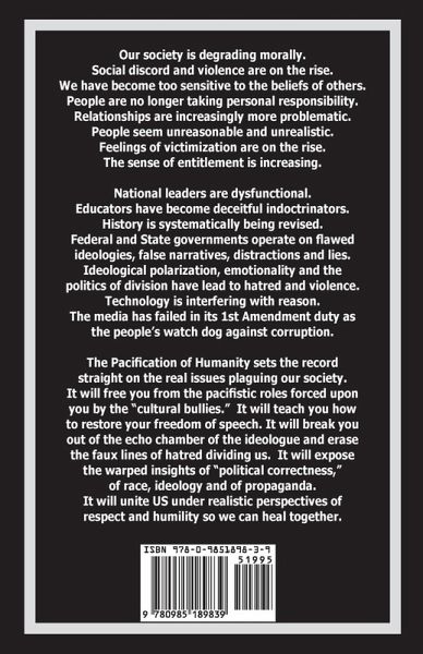 Introduction Human interaction has been infected by out of control ideology; maligned by people who will do anything to perpetuate their selfish agendas. Modern man has painted himself into a theoretical corner of how he would like things to be and the actual realities of human existence. The progressive quest for a Utopia of rainbows and Unicorns has resulted in a Dystopia of loathing, victimization, self-centeredness and entitlement. It's no longer OK to be human; in fact if you act too human you can face hate filled labels, ostracism and social retaliation from cultural bullies. Truth is the new hate speech because truth dissolves ideology. If you speak out you risk character assassination and social alienation. We have been conditioned to keep our mouths shut so the big mouths can talk. We have been told that our constitution, our traditions and our beliefs are old fashion and obsolete. We have been bullied into letting the government tell us how to raise our children. A government that now determines what our children need to know and not know. We are professionally ruined if we don't comply with the regulations of that same out of control Federal Government. We have not lost our way; it has been hidden from us by runaway ideologies. We have been purposely mislead about current events by a self serving over commercialized media that has forgotten its duty. We are paying the price for an agenda driven form of polarization that forces us to one side of the political spectrum or the other. It is no longer OK to be moderate or in the middle because according to the ideologues balanced is no longer fair. There are clear reasons why we think so differently than our parents did and why our children and grand children see the world so vastly differently than we do. Education has become indoctrination. Through repetition the definitions of words have been changed without justification or consensus. We are inhibited to speak our truth in a social setting even when we know in our hearts that our insights could make a difference. We won't speak out because it's more trouble than it is worth. Free speech is no longer free; we are being oppressed and repressed. A free people cannot fit into two little boxes designed to streamline political power. In this book I will explain to you exactly how this repression and pacification has occurred. I will put forth clear and simple methods for building our immunity against the contagions spread by the progressive ideologues on both sides. I will explain why we are experiencing so much emotional turmoil in our hearts and in our world. I will explain why nothing is ever resolved or settled. I will explain how race is used to divide us and why. I will give you needed, vital and valuable insights. I suggest that you have been made pacifistic by the bullies that are now in control of our culture and that your withdrawal from the debate is a part of their sinister plan. They demand your silence then use your silence as consent to things you vehemently oppose. While reading this book you will learn how you have been brain washed by the control of information in the form of propaganda. You'll learn how the future of freedom in the modern world is being selfishly stolen from our children by people who whole heartedly believe that they know what is best for you and yours. Your action is required. Remaining ignorant of these issues will be your consent; one day they will stop asking for that consent and then one day it will not be needed.