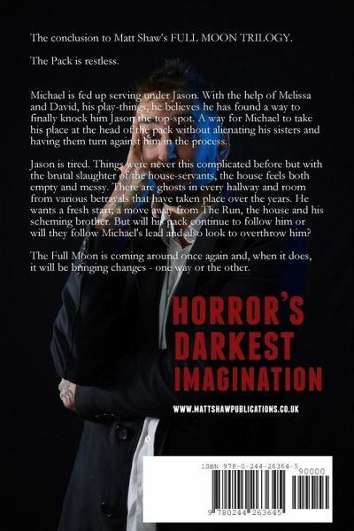 The conclusion to Matt Shaw's FULL MOON TRILOGY. The Pack is restless. Michael is fed up serving under Jason. With the help of Melissa and David, his play-things, he believes he has found a way to finally knock him Jason the top-spot. A way for Michael to take his place at the head of the pack without alienating his sisters and having them turn against him in the process. Jason is tired. Things were never this complicated before but with the brutal slaughter of the house-servants, the house feels both empty and messy. There are ghosts in every hallway and room from various betrayals that have taken place over the years. He wants a fresh start; a move away from The Run, the house and his scheming brother. But will his pack continue to follow him or will they follow Michael's lead and also look to overthrow him? The Full Moon is coming around once again and, when it does, it will be bringing changes - one way or the other.