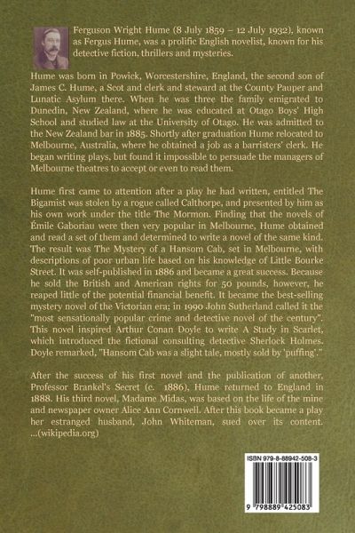 Thoroughly entertaining storyline, and even though through my modern eyes the plot twists were easy to guess they were still well handled. Despite its age the female characters are more than just window dressing or passive plot devices (even though they are subject to two dimensional stereotyping). (Andrea Swinsco) About the author Ferguson Wright Hume (8 July 1859 - 12 July 1932), known as Fergus Hume, was a prolific English novelist, known for his detective fiction, thrillers and mysteries. Hume was born in Powick, Worcestershire, England, the second son of James C. Hume, a Scot and clerk and steward at the County Pauper and Lunatic Asylum there. When he was three the family emigrated to Dunedin, New Zealand, where he was educated at Otago Boys' High School and studied law at the University of Otago. He was admitted to the New Zealand bar in 1885. Shortly after graduation Hume relocated to Melbourne, Australia, where he obtained a job as a barristers' clerk. He began writing plays, but found it impossible to persuade the managers of Melbourne theatres to accept or even to read them. Hume first came to attention after a play he had written, entitled The Bigamist was stolen by a rogue called Calthorpe, and presented by him as his own work under the title The Mormon. Finding that the novels of Émile Gaboriau were then very popular in Melbourne, Hume obtained and read a set of them and determined to write a novel of the same kind. The result was The Mystery of a Hansom Cab, set in Melbourne, with descriptions of poor urban life based on his knowledge of Little Bourke Street. It was self-published in 1886 and became a great success. Because he sold the British and American rights for 50 pounds, however, he reaped little of the potential financial benefit. It became the best-selling mystery novel of the Victorian era; in 1990 John Sutherland called it the "most sensationally popular crime and detective novel of the century". This novel inspired Arthur Conan Doyle to write A Study in Scarlet, which introduced the fictional consulting detective Sherlock Holmes. Doyle remarked, "Hansom Cab was a slight tale, mostly sold by 'puffing'." After the success of his first novel and the publication of another, Professor Brankel's Secret (c.¿1886), Hume returned to England in 1888. His third novel, Madame Midas, was based on the life of the mine and newspaper owner Alice Ann Cornwell. After this book became a play her estranged husband, John Whiteman, sued over its content. ...(wikipedia.org)