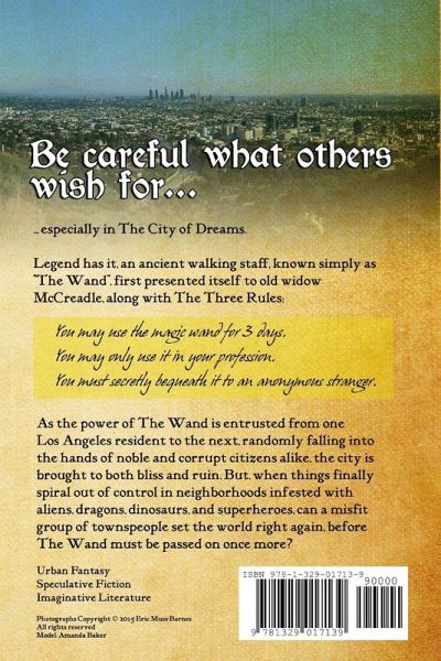 Legend has it, an ancient walking staff, known simply as "The Wand", first presented itself to old widow McCreadle, along with The Three Rules. 1. You may use the magic wand for 3 days. 2. You may only use it in your profession. 3. You must secretly bequeath it to an anonymous stranger. As the power of The Wand is entrusted from one Los Angeles resident to the next, randomly falling into the hands of noble and corrupt citizens alike, the city is brought to both bliss and ruin. But, when things finally spiral out of control in neighborhoods infested with aliens, dragons, dinosaurs, and superheroes, can a misfit group of townspeople set the world right again, before The Wand must be passed on once more?
