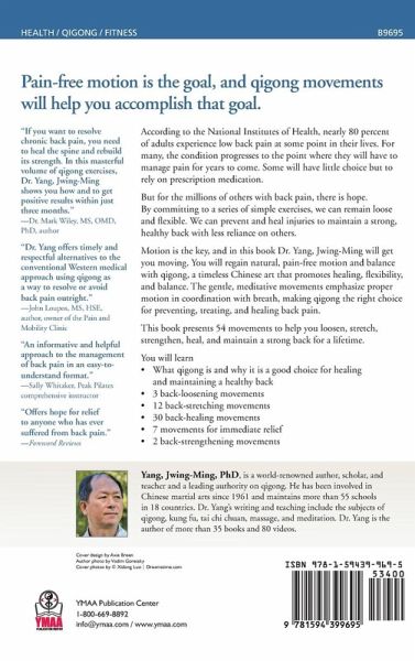 If a pain-free back is the goal, qigong movements can help! According to the National Institute of Neurological Disorders and Stroke, nearly 80 percent of adults experience low back pain at some point in their lives. For many, the condition progresses to the point where they will have to manage pain for years to come. Some will have little choice but to rely on prescription medication. For millions of others with back pain, there is hope. By committing to a series of simple exercises, you can remain loose and flexible. You can prevent and heal injuries to maintain a strong, healthy back. Motion is the key, and in this book Dr. Yang, Jwing-Ming will get you moving. You will regain natural, pain-free motion and balance with qigong, a timeless Chinese art that promotes healing, flexibility, and balance. The gentle, meditative movements emphasize proper motion in coordination with breath, making qigong the right choice for preventing, treating, and healing back pain. This book presents 54 movements to help you loosen, stretch, strengthen, heal and maintain a strong back for a lifetime. You will learn * What qigong is and why it is a good choice for healing and maintaining a healthy back * 3 back-loosening movements * 12 back-stretching movements * 30 back-healing movements * 7 movements for immediate relief * 2 back-strengthening movements * A great regimen for keeping your back healthy. Many people rely on acupuncture, chiropractic treatments, and even surgery. By committing to a simple qigong practice, you can begin to take care of your own back, with less reliance on others. Pain-free motion is the goal, and qigong movements can help you accomplish that goal.