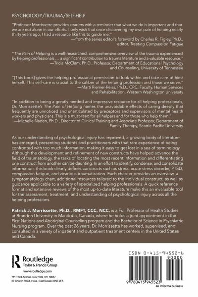 The purpose of The Pain of Helping is to provide a source that identifies, condenses, and consolidates information pertaining to psychological injury. In addition to providing details regarding construct definition, information pertaining to symptomatology, assessment instruments (e.g. structured interview, questionnaires), treatment options, leading theoreticians, journals, books, and web sites are also included. This book will serve as a primary source and directory for additional information pertaining to psychological injury. To date, there has not been a concerted effort to synthesize and consolidate the literature of psychological injury and present this valuable information in a systematic and methodological fashion.