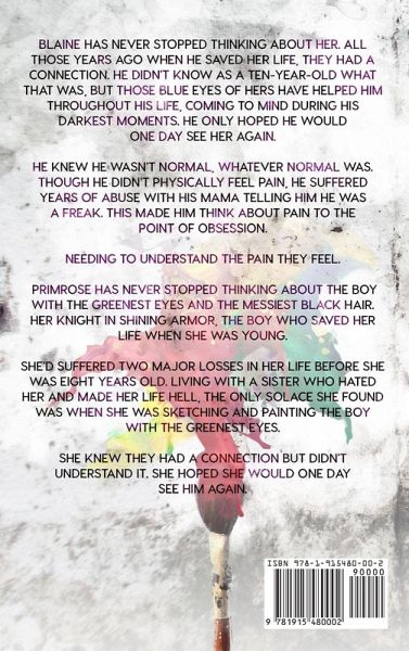 Blaine has never stopped thinking about her. All those years ago when he saved her life, they had a connection. He didn't know as a ten-year-old what that was, but those blue eyes of hers have helped him throughout his life, coming to mind during his darkest moments. He only hoped he would one day see her again. He knew he wasn't normal, whatever normal was. Though he didn't physically feel pain, he suffered years of abuse with his mama telling him he was a freak. This made him think about pain to the point of obsession. Needing to understand the pain they feel. Primrose has never stopped thinking about the boy with the greenest eyes and the messiest black hair. Her knight in shining armour, the boy who saved her life when she was young. She'd suffered two major losses in her life before she was eight years old. Living with a sister who hated her and made her life hell, the only solace she found was when she was sketching and painting the boy with the greenest eyes.She knew they had a connection but didn't understand it. She hoped she would one day see him again.