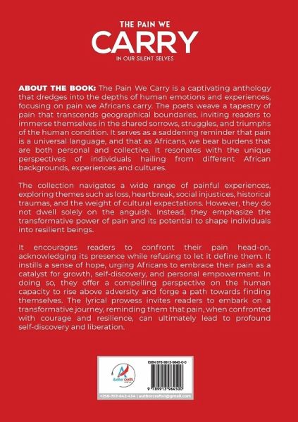 The Pain We Carry is a captivating anthology that dredges into the depths of human emotions and experiences, focusing on pain we Africans carry. The poets weave a tapestry of pain that transcends geographical boundaries, inviting readers to immerse themselves in the shared sorrows, struggles, and triumphs of the human condition. It serves as a saddening reminder that pain is a universal language, and that as Africans, we bear burdens that are both personal and collective. It resonates with the unique perspectives of individuals hailing from different African backgrounds, experiences and cultures. The collection navigates a wide range of painful experiences, exploring themes such as loss, heartbreak, social injustices, historical traumas, and the weight of cultural expectations. However, they do not dwell solely on the anguish. Instead, they emphasize the transformative power of pain and its potential to shape individuals into resilient beings. It encourages readers to confront their pain head-on, acknowledging its presence while refusing to let it define them. It instills a sense of hope, urging Africans to embrace their pain as a catalyst for growth, self-discovery, and personal empowerment. In doing so, they offer a compelling perspective on the human capacity to rise above adversity and forge a path towards finding themselves. The lyrical prowess invites readers to embark on a transformative journey, reminding them that pain, when confronted with courage and resilience, can ultimately lead to profound self-discovery and liberation.