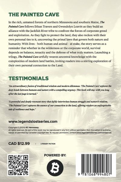 LEGENDS LOST >THE PAINTED CAVE - Book One In the rich, untamed forests of northern Minnesota and southern Maine, The Painted Cave follows Ethan Travers and Gwendolyn Leavitt as they build an alliance with the Jackfish River tribe to confront the forces of corporate greed and exploitation. As they fight to protect the Land, they also reckon with their own personal ties to it, uncovering the primal laws that govern both nature and humanity. With lives - both human and animal - at stake, the story serves as a reminder that whether in the wilderness or the corporate world, survival depends on balance, tenacity and the defense of what truly matters. Launching a trilogy, The Painted Cave artfully weaves ancestral knowledge with the complexities of modern takeovers, inviting readers into a stirring exploration of their own personal connection to the Land.