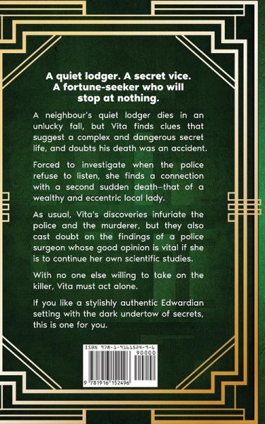 A quiet lodger. A secret vice. A fortune-seeker who will stop at nothing. A neighbour's quiet lodger dies in an unlucky fall, but Vita finds clues that suggest a complex and dangerous secret life, and doubts his death was an accident. Forced to investigate when the police refuse to listen, she finds a connection with a second sudden death - that of a wealthy and eccentric local lady. As usual, Vita's discoveries infuriate the police and the murderer, but they also cast doubt on the findings of a police surgeon whose good opinion is vital if she is to continue her own scientific studies. With no one else willing to take on the killer, Vita must act alone. If you like a stylishly authentic Edwardian setting with the dark undertow of secrets, this is one for you.