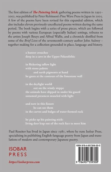 The first edition of The Painting Stick, gathering poems written in 1991-2002, was published by Peter Robinson's Pine Wave Press in Sendai, Japan, in 2005. A few of the poems have been revised for this expanded edition, which also includes eleven previously uncollected poems written during the same period. The book begins with a series of prose pieces, which are followed by poems with various European (especially Italian and Greek) settings, poems about the artists Joseph Beuys and Alfred Wallis, and a tribute to the seventeenth-century author John Aubrey - together making for a collection grounded in place, in language and in history.