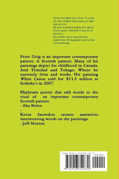 Ekphrasis poetry on Peter Doig. An important Scottish contemporary painter. The poems add words narrative and interweave stories on the visual paintings.