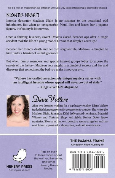 Nightie Night! Interior decorator Madison Night is no stranger to the occasional odd inheritance. But when an octogenarian friend dies and leaves her a pajama factory, the bounty is bittersweet. Once a thriving business, Sweet Dreams closed decades ago after a tragic accident took the life of a young model. Or was that simply a cover up? Between her friend's death and her own stagnant life, Madison is tempted to hide under a blanket of willful ignorance. But when family members and special interest groups lobby to expose the secrets of the factory, Madison gets caught in a tangle of secrets and lies and discovers that sometimes, the bed you make is not your own. - - - - - - - - - - - - - THE PAJAMA FRAME by Diane Vallere A Henery Press Mystery. If you like one, you'll probably like them all.