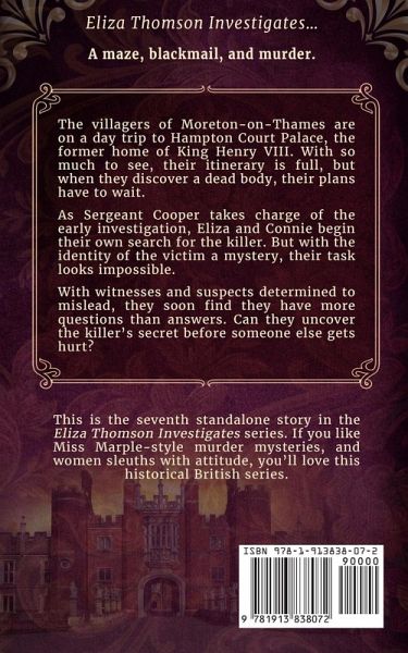 Murder, blackmail, and a maze. Eliza Thomson Investigates... An anonymous victim, a missing murder weapon, and a trail back to Moreton-on-Thames. An unexpected finding disrupts the church day out to Hampton Court Palace, the former home of King Henry VIII. A gentleman in a smart suit draws attention as he walks through the grounds. His swagger raising the hackles of some who see him. He appears to be on a mission; as does the tall, dark stranger who follows him. Someone knows his secrets and is ready to kill to stop his plans. With witnesses and suspects determined to mislead, amateur sleuth Eliza Thomson and her friend Connie take it upon themselves to investigate... This is the seventh standalone story in the Eliza Thomson Investigates series. If you like Miss Marple-style murder mysteries, and women sleuths with attitude, you'll love this historical British series.