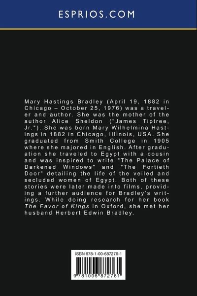 Mary Hastings Bradley (April 19, 1882 in Chicago - October 25, 1976) was a traveler and author. She was the mother of the author Alice Sheldon ("James Tiptree, Jr."). She was born Mary Wilhelmina Hastings in 1882 in Chicago, Illinois, USA. She graduated from Smith College in 1905 where she majored in English. After graduation she traveled to Egypt with a cousin and was inspired to write "The Palace of Darkened Windows" and "The Fortieth Door" detailing the life of the veiled and secluded women of Egypt. Both of these stories were later made into films, providing a further audience for Bradley's writings. While doing research for her book The Favor of Kings in Oxford, she met her husband Herbert Edwin Bradley.