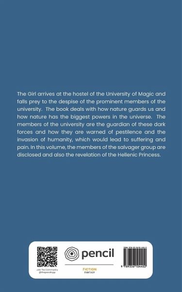 The Girl arrives at the hostel of the University of Magic and falls prey to the despise of the prominent members of the university. The book deals with how nature guards us and how nature has the biggest powers in the universe. The members of the university are the guardian of these dark forces and how they are warned of pestilence and the invasion of humanity, which would lead to suffering and pain. In this volume, the members of the salvager group are disclosed and also the revelation of the Hellenic Princess.