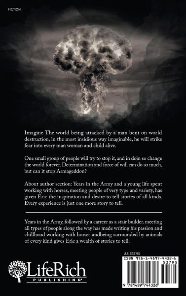 Imagine The world being attacked by a man bent on world destruction, in the most insidious way imaginable, he will strike fear into every man woman and child alive. One small group of people will try to stop it, and in doin so change the world forever. Determination and force of will can do so much, but can it stop Armageddon? About author section: Years in the Army and a young life spent working with horses, meeting people of very type and variety, has given Eric the inspiration and desire to tell stories of all kinds. Every experience is just one more story to tell.