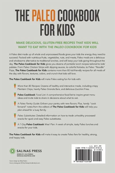 Make delicious, gluten-free recipes that kids will want to eat with The Paleo Cookbook for Kids. A Paleo diet made up of whole and unprocessed foods gives your kids the energy they need to succeed. Packed with nutritious fruits, vegetables, nuts, and meats, Paleo meals are a delicious and wholesome alternative to traditional lunches, and will keep your kids going throughout the day. The Paleo Cookbook for Kids gives you dozens of portable lunch recipes tailored to kids' palates. From Paleo Chicken Strips with dipping sauces, to colorful Kebabs, to Paleo "Noodle" Pizza, The Paleo Cookbook for Kids contains more than 80 kid-friendly recipes for all meals of the day with flavors, textures, colors, and crunch that kids will love. The Paleo Cookbook for Kids will make Paleo eating fun for kids with: More than 80 Recipes: Dozens of healthy and interactive meals, including crispy Plaintain Chips, hearty Paleo Granola Bars, and delicious Zucchini Fries. Paleo Cookbook Food List: A comprehensive food list to inspire great menu ideas and invite kids to share in decisions about what to eat. A Paleo Pantry Guide: Enliven your pantry with new flavors. Plus, handy "cook forward" notes from the editors of The Paleo Cookbook for Kids will help you plan ahead for a busy family. Paleo Substitutes: Detailed information on how to trade unhealthy processed snacks for quick and easy Paleo substitutes. A 7-Day Paleo Cookbook Meal Plan: A week of simple, tasty Paleo lunches and snacks for your kids. The Paleo Cookbook for Kids will make it easy to create Paleo fare for healthy, strong, and happy kids.